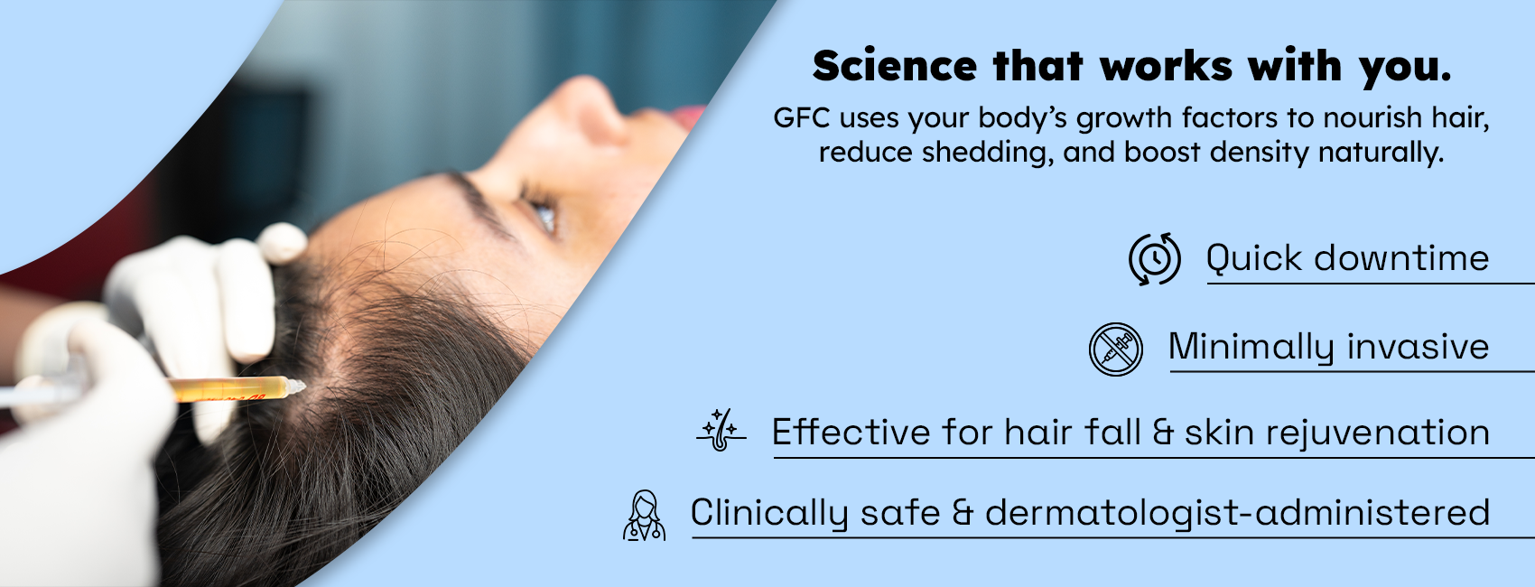 Both PRP and GFC are effective treatments for early-stage hair loss. Your consultant will recommend the ideal treatment based on your specific needs and preferences.